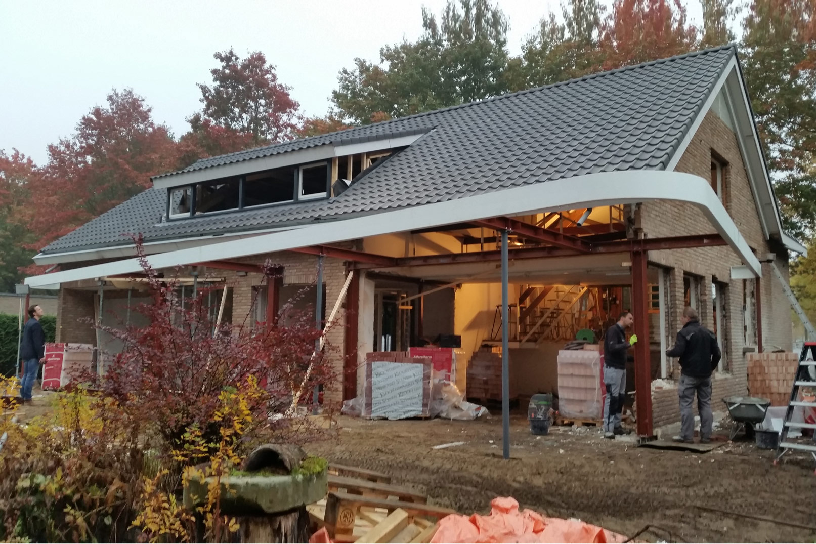 De verbouwing van villa L te Waalre is in volle gang. Deze week is door aannemersbedrijf Van Kaathoven Bouw de staalconstructie geplaatst van de kenmerkende gekromde luifel.
